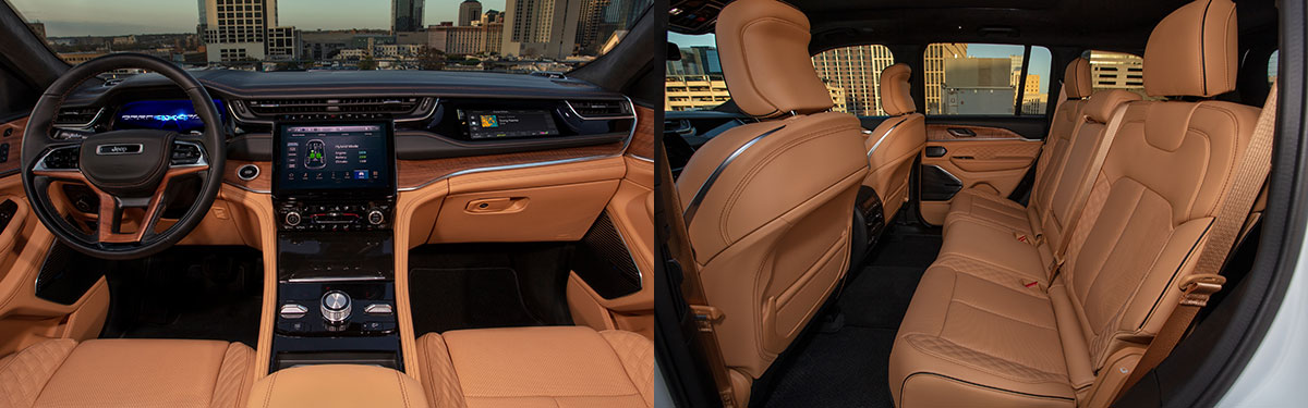 With prices ranging from $41,000 to $70,000, trim levels include Laredo, Altitude, Limited, Trailhawk, Overland and Summit. Standard equipment includes LED headlights, 18-inch wheels, roof rails, tri-zone automatic climate control, power-adjustable driver's seat, sliding second-row captain's chairs, proximity keyless entry and push-button start, 10.25-inch driver information display, 8.4-inch touchscreen with wireless support for Apple CarPlay and Android Auto, six-speaker stereo system, adaptive cruise control, blind-spot monitor with rear cross-traffic alert and forward collision warning with brake intervention. The Trailhawk trim adds Goodyear Wrangler Territory all-terrain tires, adaptive air suspension with selectable ride height settings, electronic rear limited-slip differential, electronically disconnecting stabilizer bar, hill ascent and descent control, front tow hooks, front-facing camera, gloss black roof, auto-dimming rearview mirror, ventilated front seats, leather upholstery with faux leather and faux suede accents, navigation system and 9-speaker Alpine audio system.